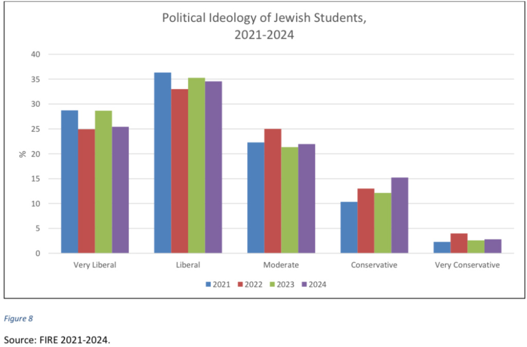 Secondo un recente report scritto dal politologo canadese Eric Kaufmann, docente presso l’Università di Buckingham in Inghilterra, la percentuale di studenti ebrei della Ivy League che hanno affermato di autocensurarsi più volte alla settimana in merito alle proprie opinioni andava dal 10 per cento al 13 per cento nel triennio 2021-2023, ma è balzata al 35 per cento nel 2024. Allo stesso tempo, gli studenti conservatori della Ivy League hanno registrato un forte calo nell’autocensura, che nel periodo 2021-2023 oscillava tra il 55 per cento e il 58 per cento, ma era crollata al 31 per cento nel 2024.