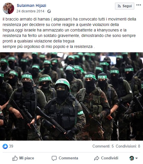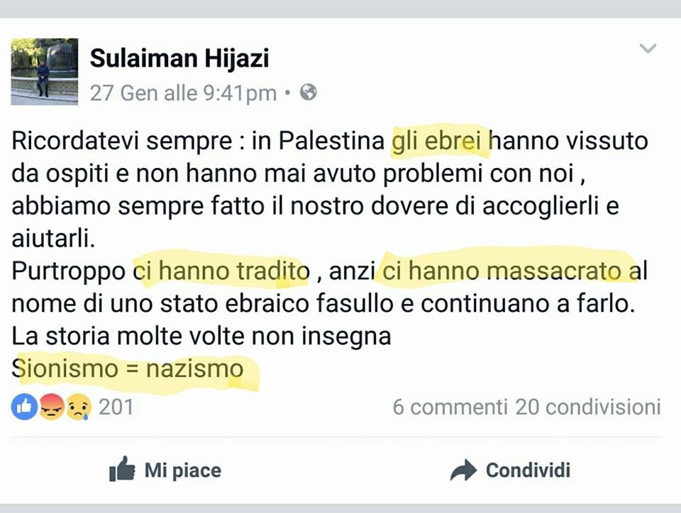 Dunque, caro Donnoli, le critiche che Nibras e Sulaiman stanno ricevendo non sono il frutto di un “gomblotto” della destra, come lei ha lasciato intendere nel suo commento su Facebook. Sono semplicemente il risultato del piatto che il signor Sulaiman Hijazi si è cucinato da solo, con i suoi post pubblici su Facebook (profilo che ora ha reso privato…), capaci di attirare persino i like e i cuoricini di Francesco Giordano, già terrorista rosso mai pentito e apertamente sostenitore del gruppo terroristico palestinese Fronte Popolare di Liberazione della Palestina.