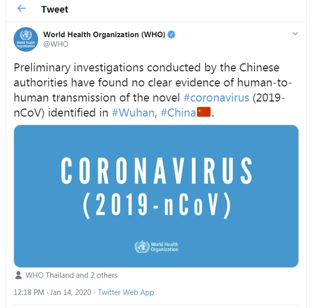 L’allarme sulla trasmissibilità da persona a persona arrivato il 31 dicembre direttamente all’Oms dalle autorità di Taiwan, ma ancora dopo due settimane lo sciagurato tweet del 14 gennaio, di cui abbiamo parlato poco sopra. Passerà un’altra settimana prima che la trasmissibilità umana venga ufficializzata.