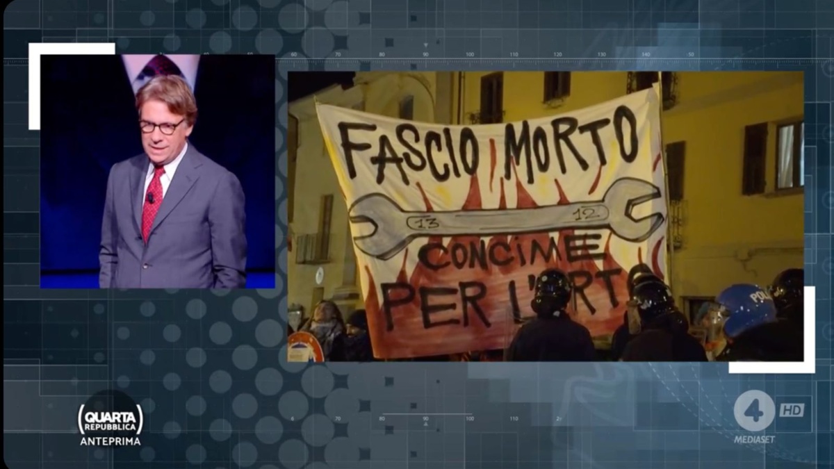A Susa la tensione è salita alle stelle come mostrato in diretta da Quarta Repubblica. L’inviato della trasmissione ha mostrato a Nicola Porro uno striscione comparso all’esterno della biblioteca comunale. La reazione del conduttore – «È uno schifo» – sintetizza bene lo sdegno provocato dal cartello: una chiave inglese, la stessa arma con cui venne ucciso Sergio Ramelli, accompagnata dalla frase “fascio morto, concime per l’orto”. L’iniziativa è stata messa in scena da gruppi antifascisti radunati in corteo dopo le proteste dell’Anpi.