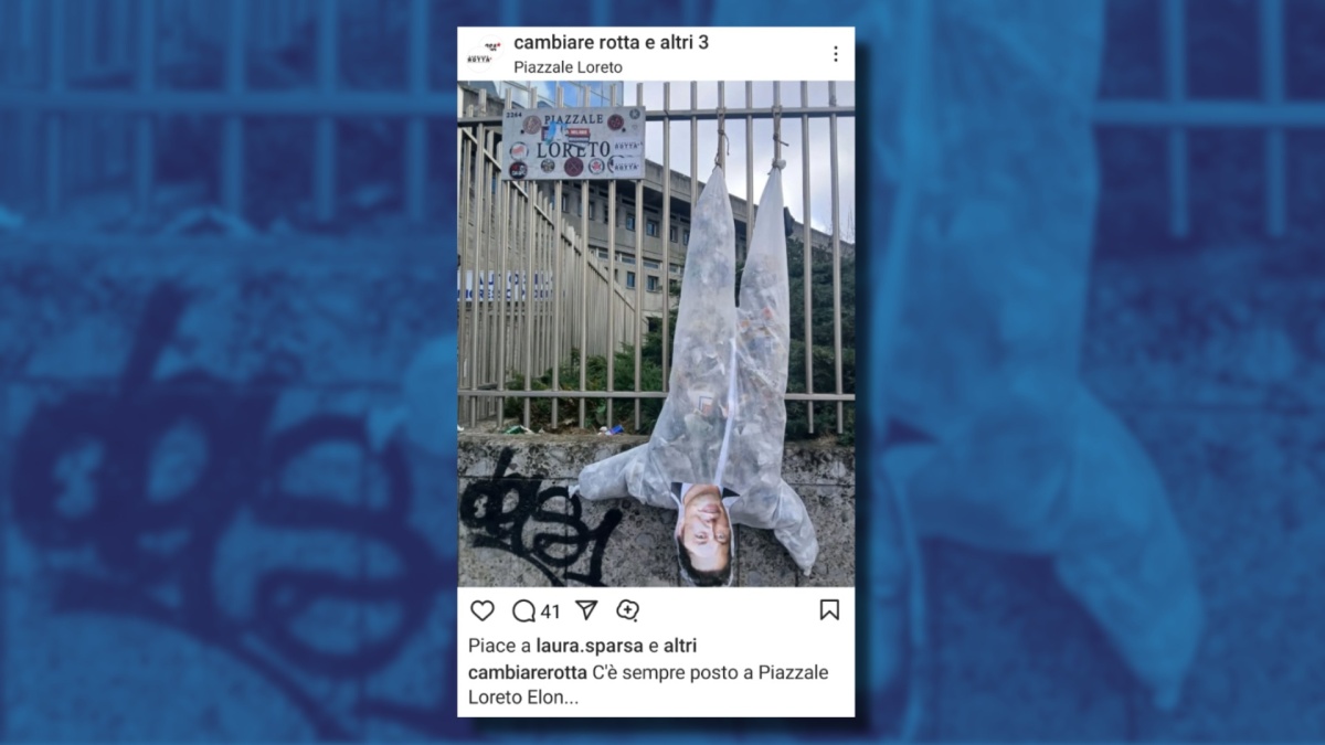 Sui social, infatti, Cambiare Rotta, lo stesso movimento che aveva organizzato – per dirne una – le proteste di Pisa finite negli scontri con la polizia, ha pubblicato una immagine eloquente: si vede un manichino con il volto di Elon Musk appeso a testa in giù a Milano. “C’è sempre posto a Piazzale Loreto, Elon”, si legge. Il riferimento, neppure troppo velato, è una minaccia di morte. Sta a significare: ti faremo fare la fine di Mussolini.