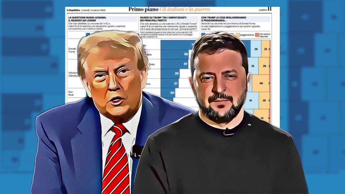 I titoli di Repubblica lasciano sempre un po’ il tempo che trovano. Però il sondaggio di Ivo Diamanti sulla percezione che gli italiani hanno della guerra in Ucraina, della gestione dei conflitti da parte di Donald Trump e il loro giudizio su Volodymyr Zelensky è invece decisamente interessante. Sintesi brutale: gli elettori nostrani danno un voto maggiore a The Donald che al povero presidente ucraino, umiliato alla Casa Bianca; sono convinti che con il tycoon miglioreranno e non poco le possibilità di raggiungere la pace a Kiev, qualsiasi essa sia; e credono che grazie al neo presidente Usa sarà anche più facile risolvere la questione israelo-palestinese.