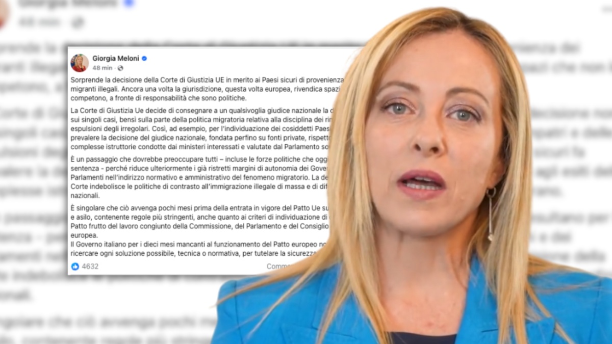 “Sorprende la decisione della Corte di Giustizia UE in merito ai Paesi sicuri di provenienza dei migranti illegali – scrive la premier sui social, visibilmente irritata – Ancora una volta la giurisdizione, questa volta europea, rivendica spazi che non le competono, a fronte di responsabilità che sono politiche. La Corte di Giustizia Ue decide di consegnare a un qualsivoglia giudice nazionale la decisione non sui singoli casi, bensì sulla parte della politica migratoria relativa alla disciplina dei rimpatri e delle espulsioni degli irregolari. Così, ad esempio, per l’individuazione dei cosiddetti Paesi sicuri fa prevalere la decisione del giudice nazionale, fondata perfino su fonti private, rispetto agli esiti delle complesse istruttorie condotte dai ministeri interessati e valutate dal Parlamento sovrano”.