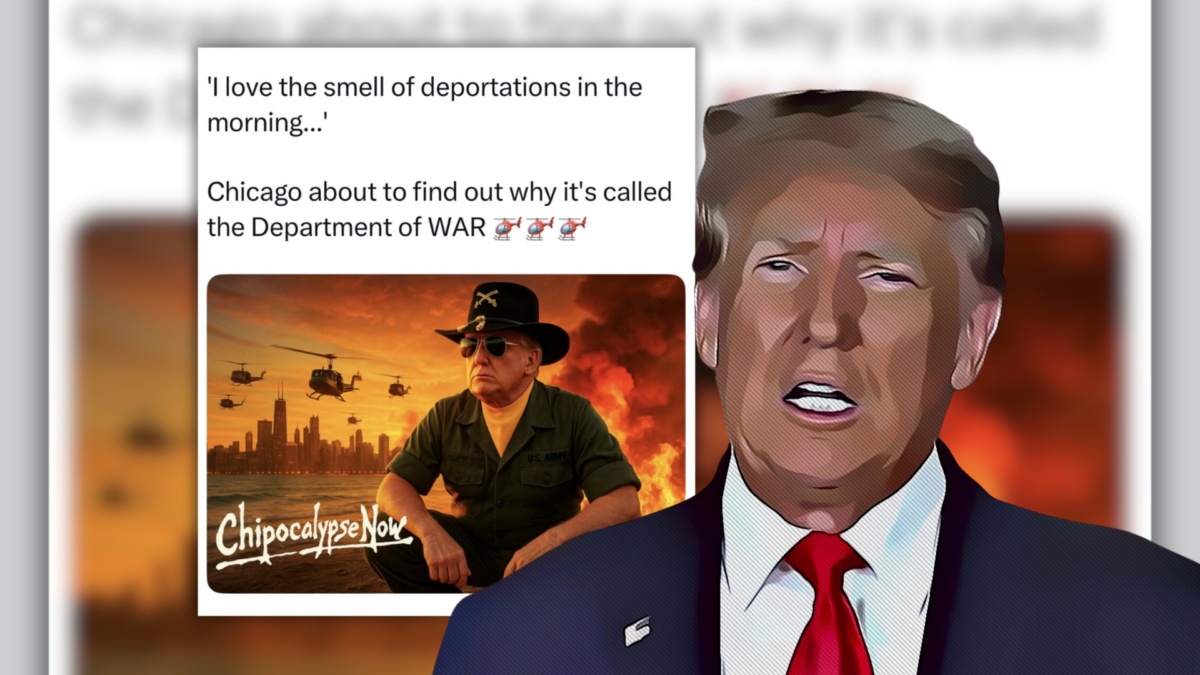 Donald Trump provoca. E lo fa vestendo i panni di “Apocalypse Now”. Per rispondere al sindaco di Chicago, uno dei suoi maggiori oppositori in tema di espulsione di immigrati irregolari, il presidente americano ha pubblicato un’immagine sul social Truth con la scritta “adoro l’odore delle espulsioni al mattino”, facendo ovviamente il verso al tenente colonnello Kilgore dice “Adoro l’odore del napalm al mattino… Sa di vittoria… Un giorno questa guerra finirà”. Nell’immagine, si vede The Donald vestito con un cappello da cowboy, divisa dell’esercito e i grattacieli di Chicago avvolti dalle fiamme.