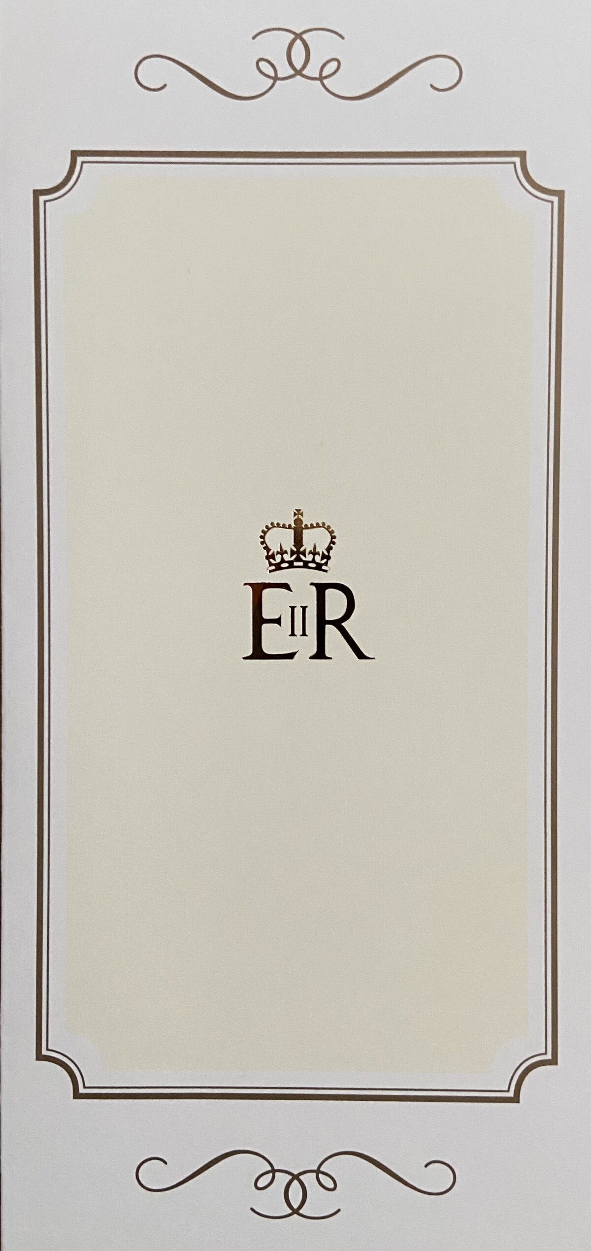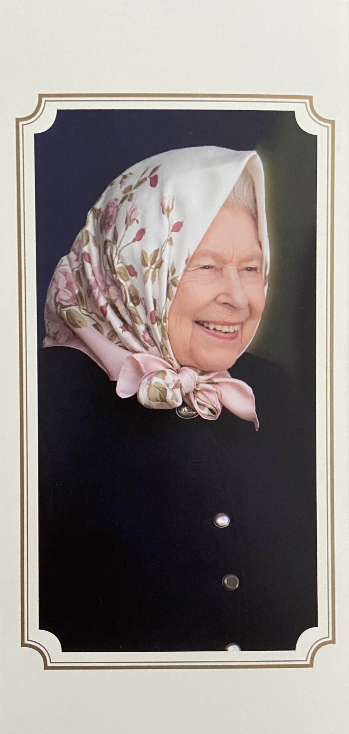 Un cartoncino di 4 pagine. Sulla copertina capeggia la sigla coronata E II R, la firma della sovrana (Elisabetta II regina: R è l’abbreviazione latina di “regina” o “rex”, in uso presso i regnanti inglesi dai tempi di Enrico I nel XII secolo). All’interno si trova una foto ufficiale sorridente con il messaggio firmato semplicemente con il consueto “Elizabeth R”. Sul retro del biglietto, infine, una foto decisamente informale e forse più privata. Queen Elizabeth è ritratta con uno dei suoi inseparabili foulard, probabilmente indossato durante una delle amate escursioni in campagna. Questo ricorda l’aspetto più personale della regina, mostrando la nota e mai nascosta passione per i cavalli e l’equitazione.
