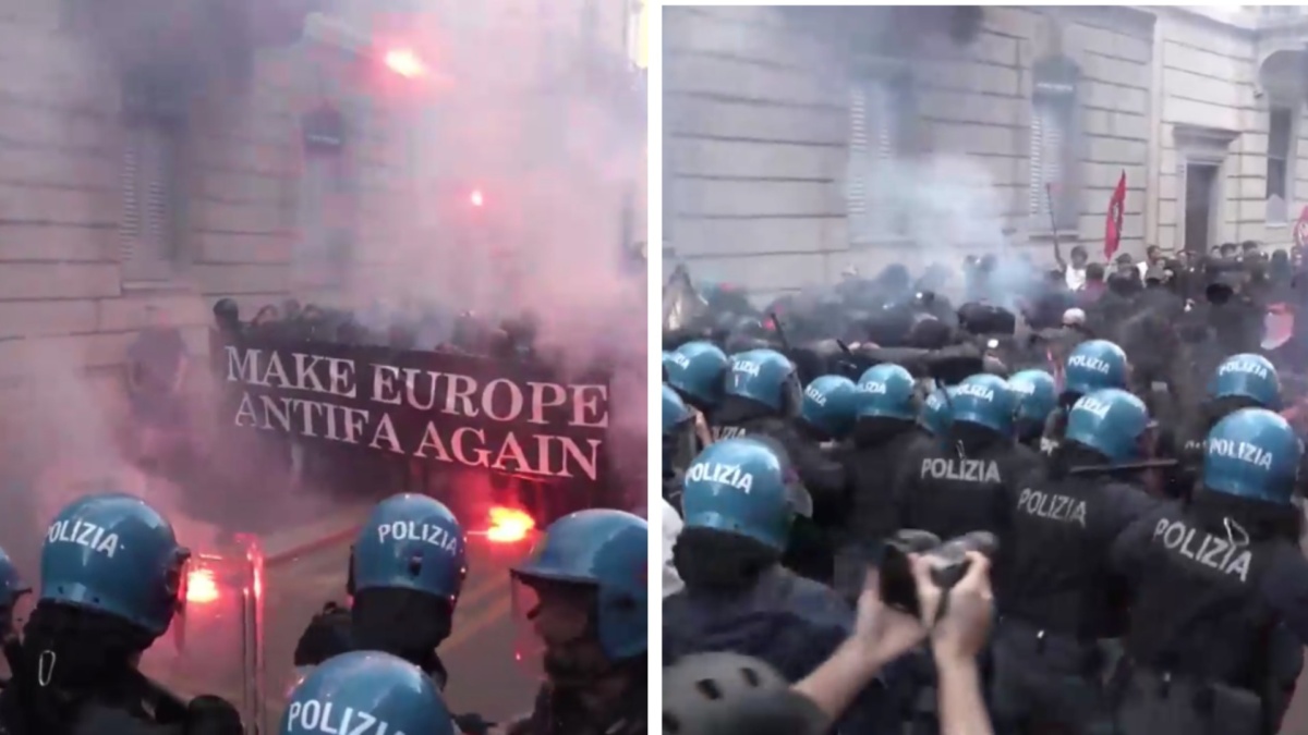 A guidare il corteo c’era un grande striscione nero con la scritta bianca: “Make Europe Antifa Again“. Tra i manifestanti erano presenti anche gruppi provenienti da fuori città e dall’estero. Gli obiettivi dichiarati del corteo includevano la stazione di Cadorna e il Palazzo delle Stelline, quest’ultimo sede di uffici della rappresentanza europea in Italia. Tuttavia, l’accesso a queste aree era bloccato da imponenti schieramenti di forze dell’ordine, pronti a intervenire per prevenire infiltrazioni o atti di violenza.