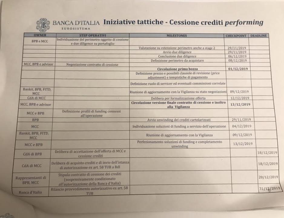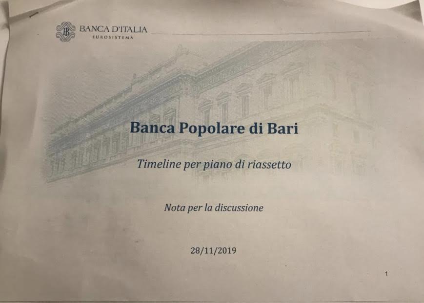 E proprio per le sofferenze bancarie, semplificando, oggi la popolare di Bari muore. Banca d’Italia ha cercato fino all’ultimo di salvare Bari e se stessa. E nel documento che pubblichiamo si vede lo sforzo, poi rivelatosi velleitario, di gettare la palla più in là. Per prima cosa era necessario mettere in opera alcune operazioni «tattiche» per far sì che entro la fine dell’anno la banca non fosse costretta a portare i libri in tribunale. Ad aiutarla un soggetto pubblico, il Medio credito centrale, e uno di origine bancaria e cioè il Fondo interbancario. Il Medio credito avrebbe dovuto in meno di una settimana individuare circa 600 milioni (ma la cifra è incerta) di crediti in bonis (cioè prestiti che non danno problemi) nei bilanci della Popolare e comprarli. In questo modo avrebbe alleviato i cosiddetti assorbimenti di capitale.