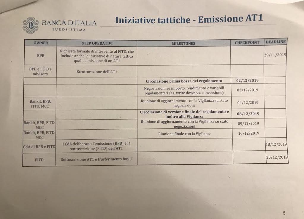 Un cronoprogramma da brivido con l’autorizzazione alla cessione crediti che palazzo Kock avrebbe rilasciato il 31 dicembre e con una due diligence di una settimana. Ma non sarebbe bastato a rendere le spalle di Bari sufficientemente larghe. Ecco l’individuazione di una seconda operazione tattica. Questa volta sarebbe stato coinvolto il Fondo interbancario, che avrebbe dovuto iniettare 50/70 milioni di capitale fresco nella banca. In questo caso tutto si sarebbe dovuto risolvere entro il 20 dicembre, con il consiglio di amministrazione della banca che emetteva il nuovo capitale (in realtà si chiama tecnicamente AT1 ed è uno strumento finanziario cosiddetto ibrido) e il comitato di gestione del Fondo che docilmente lo avrebbe dovuto sottoscrivere.