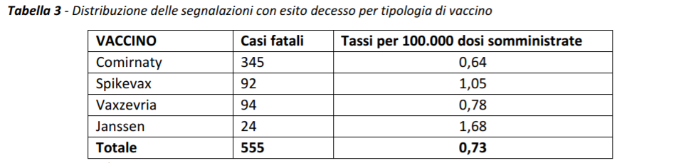 Per le segnalazioni di decesso invece, Aifa comunica la seguente nota a commento della tabella 3 dello stesso report:
