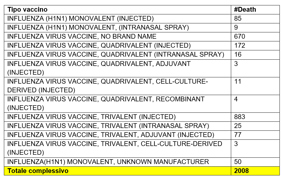 Inoltre se consideriamo solo le tipologie di vaccini per influenza stagionale somministrate, queste raggiungono il numero di rilevazioni per decessi pari a 2008 casi, quindi otto volte di meno rispetto ai preparati Covid-19.
