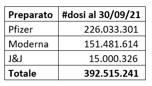 Al 30 settembre 2021 il numero di dosi somministrate negli USA di vaccini per la Covid-19 sono state: