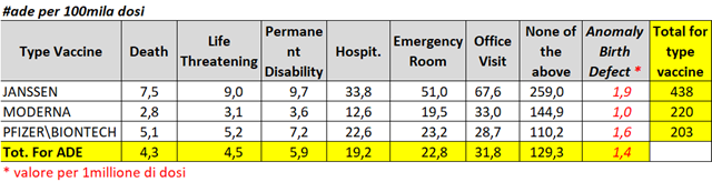 - per Janssen un tasso di 85 à mentre il VAERS 438 casi per 100mila dosi;