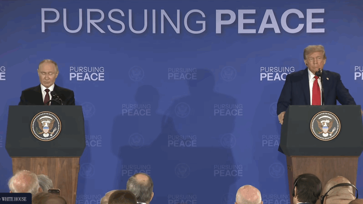 Il palco è composto da due pulpiti abbastanza distanti, le bandiere russa e americana dietro ognuno dei due presidenti e una grande scritta campeggia al centro dell’inquadratura: “pursuing peace“, cioè perseguire la pace, ovvero lo scopo che Donald Trump si era dato per questo storico incontro con lo Zar.